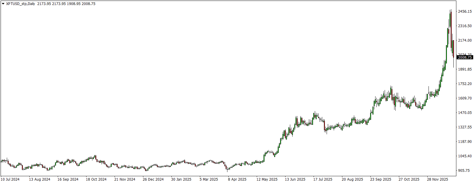 Vývoj ceny platiny (denní graf - D1):