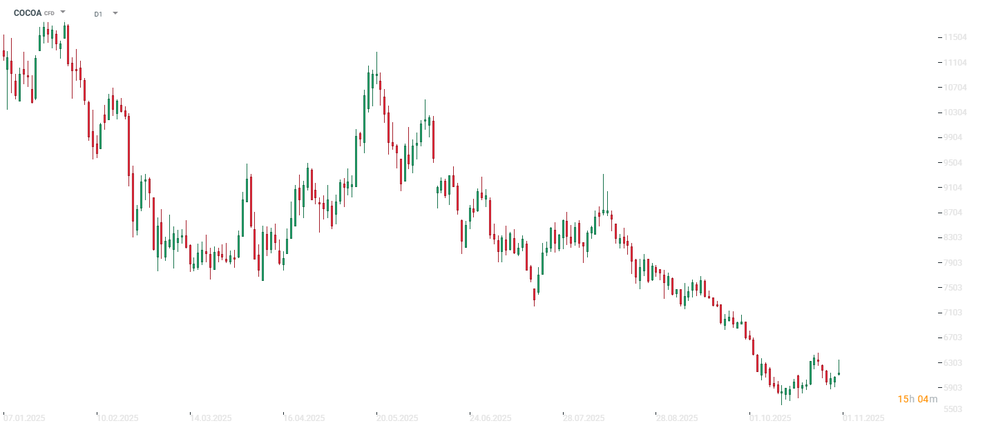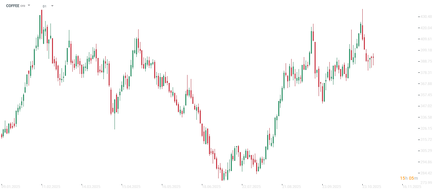 Káva arabica patří mezi nejvíce zdražující komodity. Od ledna vzrostla její cena o 24 procent a v říjnu se dostala na rekord. Ceny stouply, když Spojené státy zavedly 50procentní clo na brazilskou kávu a v obavách z nepříznivého počasí v hlavních pěstitelských oblastech Brazílie a Vietnamu. Kakao naopak zažívá letos prudký pád. Cena kakaa se po loňských rekordech propadla o 46 procent, protože se úroda v Africe zotavila a trh přešel z deficitu do přebytku.