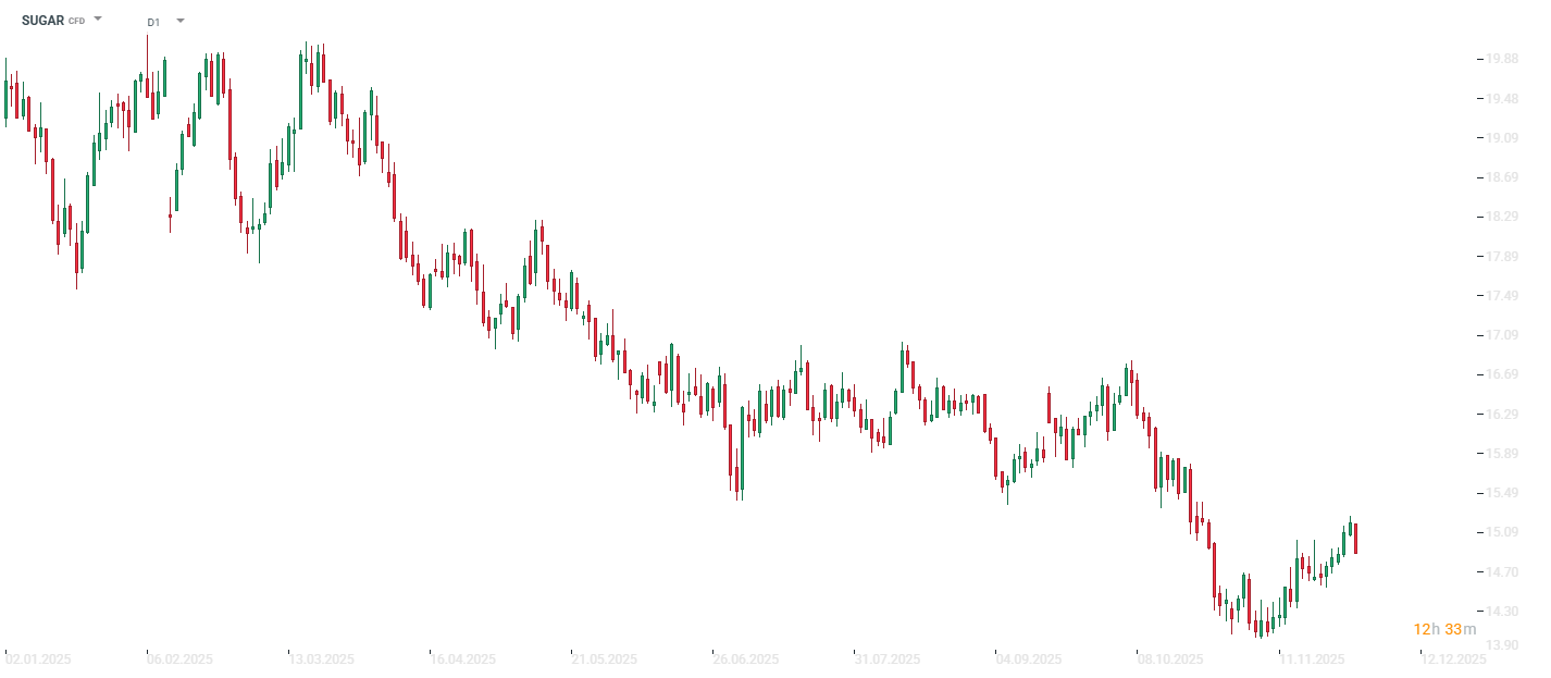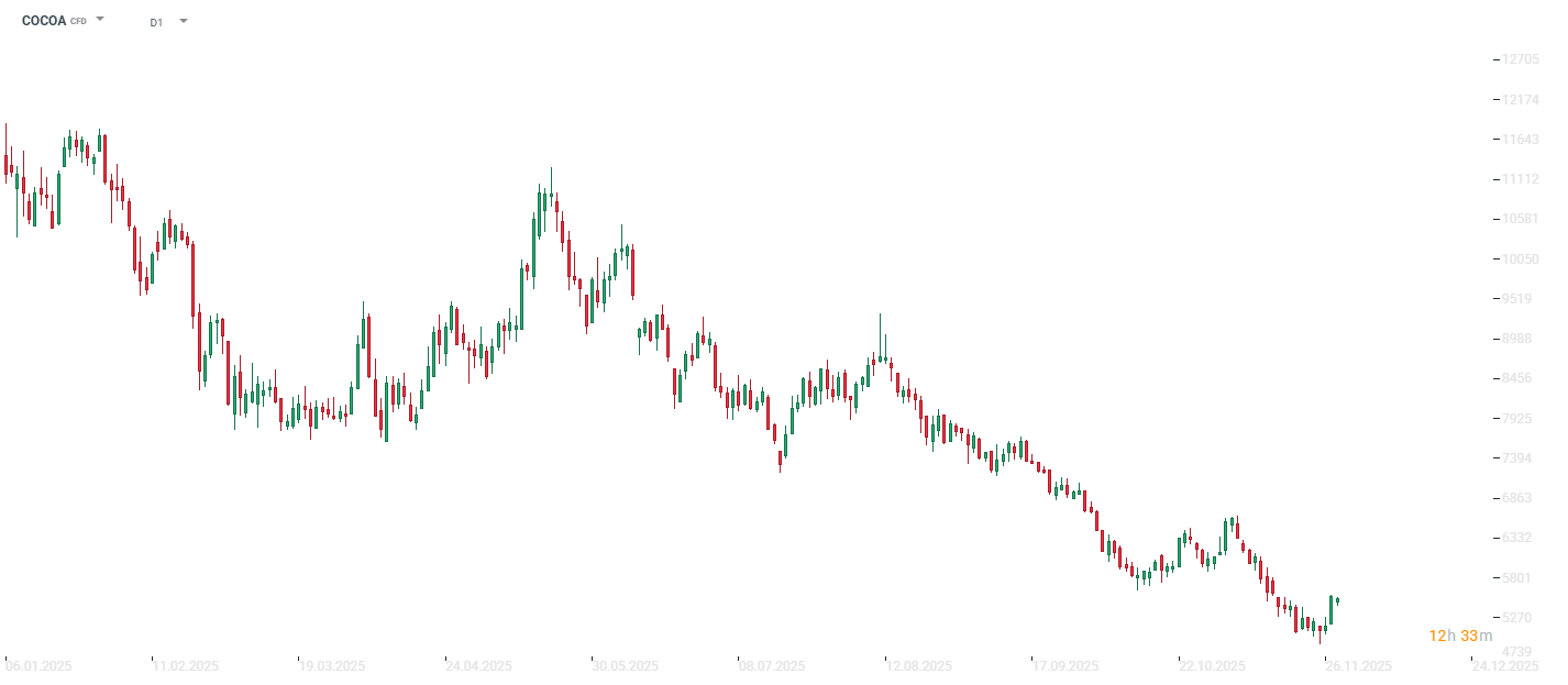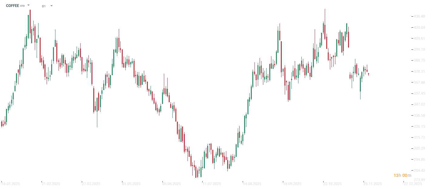 Káva Arabica patří mezi nejrychleji zdražující komodity. Od ledna vzrostla její cena o 28 procent a v říjnu vystřelila na rekord. Ceny vyletěly vzhůru po zavedení mimořádného 50procentního cla USA na brazilskou kávu v průběhu roku, v kombinaci s obavami z nepříznivého počasí a slabé úrody v hlavních pěstitelských oblastech Brazílie a Vietnamu. Naopak kakao letos zažilo prudký pád, když po loňských rekordních cenách se propadá o 57 procent. Letošní úroda v západní Africe vypadá příznivě a Evropská komise čerstvě odložila nařízení o odlesňování.