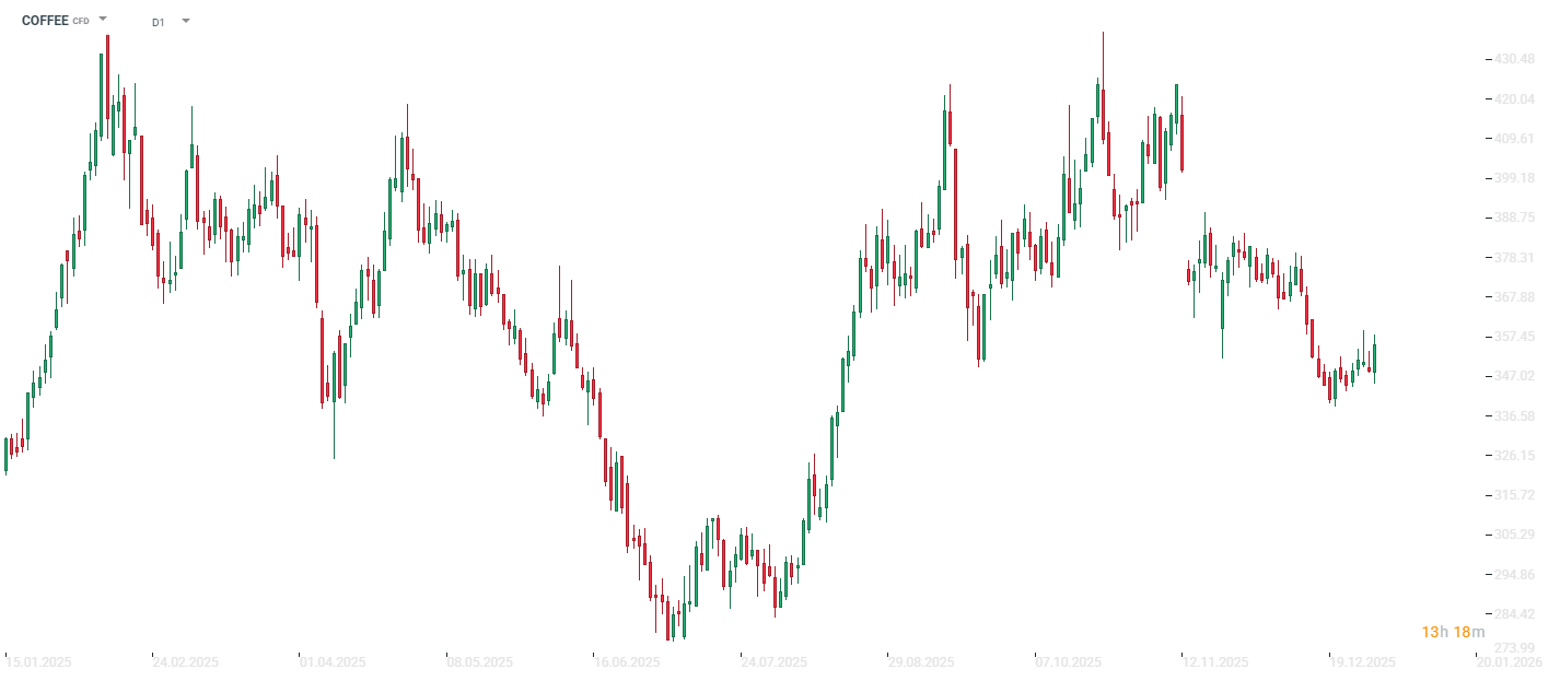 Káva Arabica patřila v roce 2025 mezi nejvíce růstové zemědělské komodity. Přidala nakonec devět procent, i když v průběhu roku byla její cena značně rozkolísaná. Dostala se až na rekord s růstem o 34 procent v říjnu. Ceny vyletěly vzhůru po zavedení mimořádného 50procentního cla USA na brazilskou kávu spolu s obavami z nepříznivého počasí a slabé úrody v hlavních pěstitelských oblastech Brazílie a Vietnamu. V listopadu ovšem USA clo zrušily, což způsobilo prudký pokles cen.