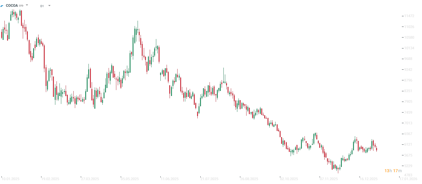 Naopak kakao si prošlo mimořádným pádem, jeho cena se propadla o 48 procent, nejvíce za několik dekád. Po loňských rekordech pomohla ceny srazit dobrá sklizeň v západní Africe, která přinesla mírný přebytek na globálním trhu. Zároveň se pozitivně projevil odklad účinnosti regulace Evropské komise proti odlesňování.