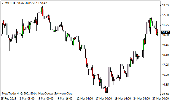 Vývoj ceny ropy WTI (4hodinový graf – H4):
