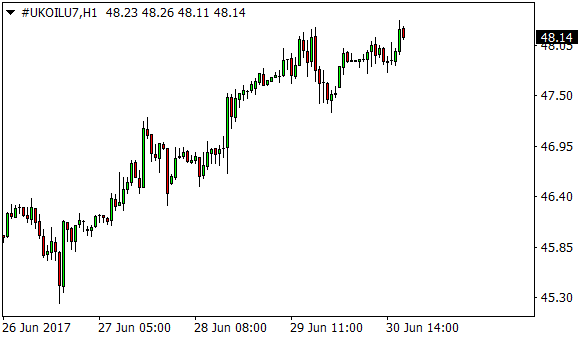 Vývoj ceny ropy Brent (1hodinový graf – H1):