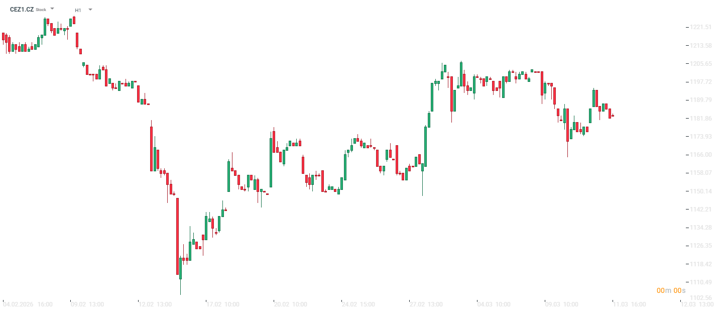 Vývoj ceny akcií ČEZ (1hodinový graf - H1):