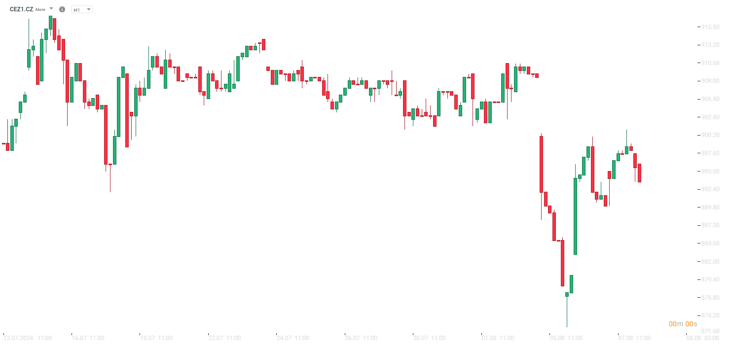 Vývoj ceny akcií ČEZ (1hodinový graf - H1):
