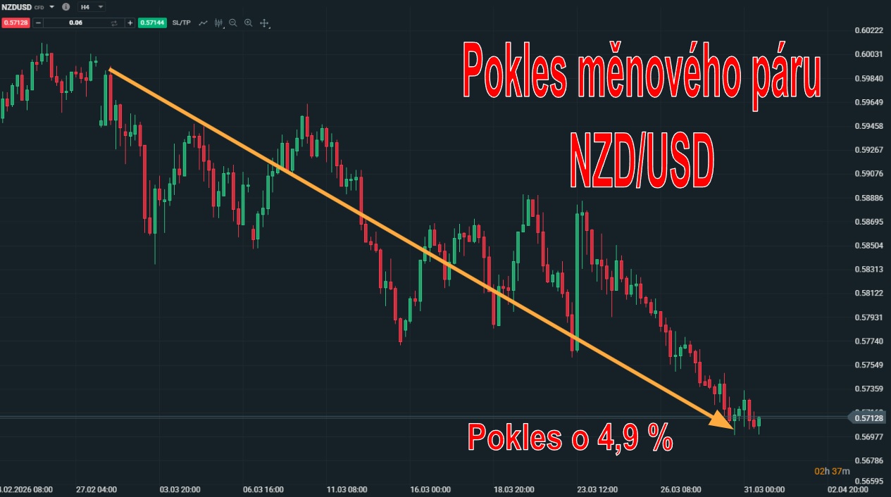 Tento měnový pár v sobě koncentruje kontrast nejsilnější a nejslabší měny. Americký dolar totiž v březnu výrazně posiloval, zatímco novozélandský dolar naopak ztrácel, čímž si vysloužil pozici nejslabší měny měsíce. Právě tento rozdíl vytvořil ideální podmínky pro swingové pohyby, na kterých mohli obchodníci dosahovat výrazných zhodnocení.
