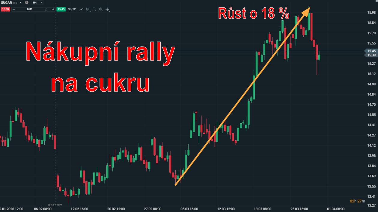 Například akcie Micron po delší době oslabily a ukázaly, jak rychle se dokáže sentiment na trhu otočit. Právě tento pokles otevřel prostor pro zajímavou prodejní korekci, na které mohli aktivní obchodníci profitovat. Zatímco akcie ztrácely půdu pod nohama, ne všechny trhy reagovaly stejně. Cukr šel výrazně proti proudu a jeho cena v březnu vzrostla o 18 %, navíc téměř bez výraznějších korekcí.