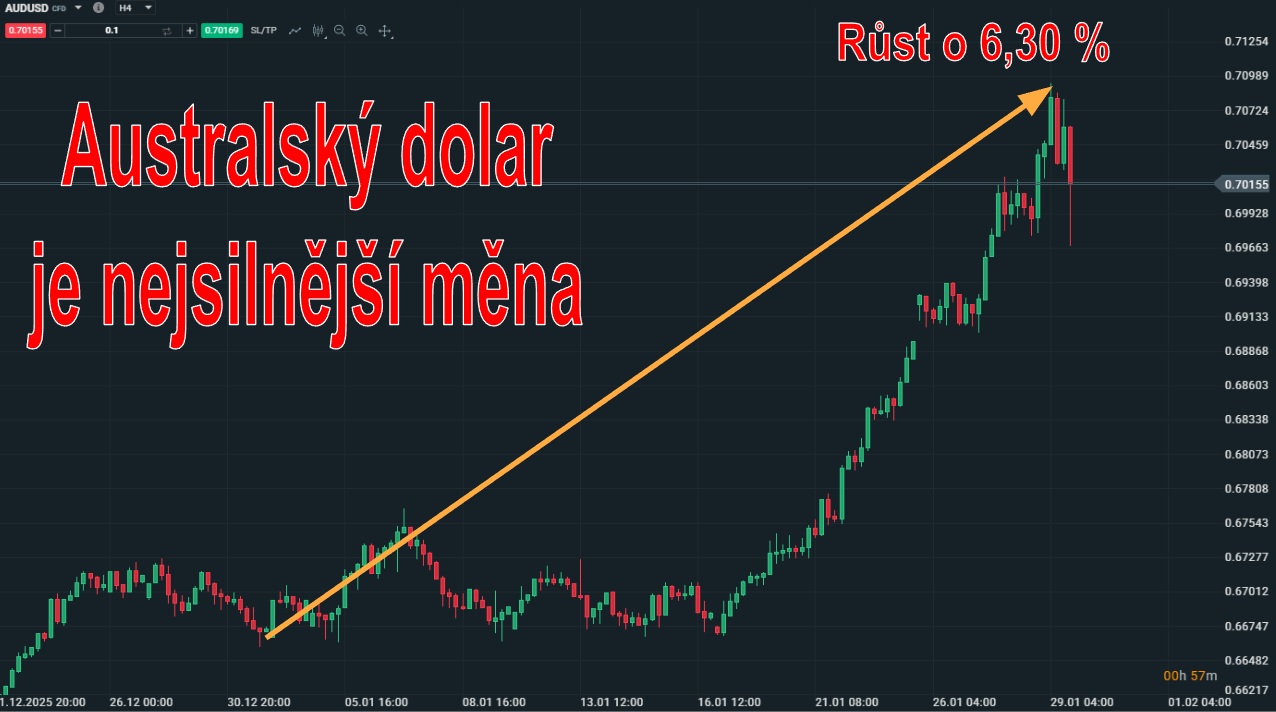 Na měnových trzích začal nový obchodní rok ve stejném duchu, v jakém ten předchozí skončil. Americký dolar pokračoval v oslabování, čehož naplno využil australský dolar k velmi agresivnímu růstu. Růst australského dolaru nakonec vygeneroval 6,30 % a vše se odehrálo bez výraznějších prodejních korekcí. Obchodníci tak mohli realizovat zajímavé a rychlé zisky.
