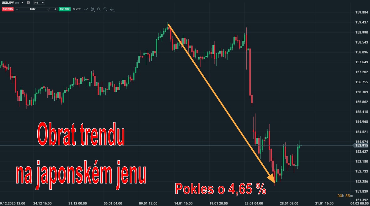 Stále častěji se spekuluje o přelivu kapitálu z amerického dolaru do japonského jenu. Možná se tento scénář už začíná naplňovat, protože v závěru ledna japonský jen vůči dolaru velmi výrazně posílil (pár USD/JPY oslabil). Klesající trend na tomto měnovém páru nakonec vygeneroval 4,65 %. Obchodníci, kteří sledují tok kapitálu v širším makroekonomickém kontextu, tak mohli realizovat slušné zisky. Příležitost však měli i běžní obchodníci, a to díky téměř učebnicovému dvojitému vrcholu, který měnový pár před samotným poklesem vykreslil.