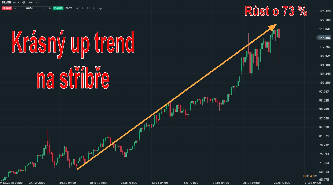 Stříbro se stalo symbolem cenového růstu roku 2025 a ani začátek nového roku 2026 na tomto tempu nic nemění. V lednu tato komodita znovu těžila ze silné průmyslové poptávky a předvedla impozantní růst o 73 % a dostala se nad magickou hranici 100 USD za unci. Obchodníci, kteří dokážou trpělivě držet nerealizované zisky a nenechají se rozhodit krátkodobými výkyvy, tak mohli svůj zisk na stříbře dál výrazně navyšovat. Na své si však přišli i krátkodobí spekulanti, protože prudké a dynamické pohyby nabízely řadu rychlých obchodních příležitostí.