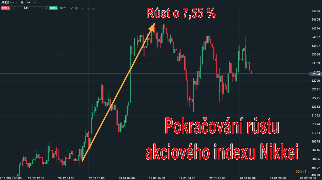 Nejvýkonnějším akciovým indexem se v lednu stal japonský Nikkei, který posílil o 7,55 %. Hlavní část tohoto růstu přišla hned na začátku roku, zatímco zbytek měsíce se nesl ve znamení zvýšené volatility. Právě takové prostředí vyhovovalo jak dlouhodobým, tak i krátkodobým obchodníkům, kteří mohli nový obchodní rok odstartovat v příjemně zelených číslech.
