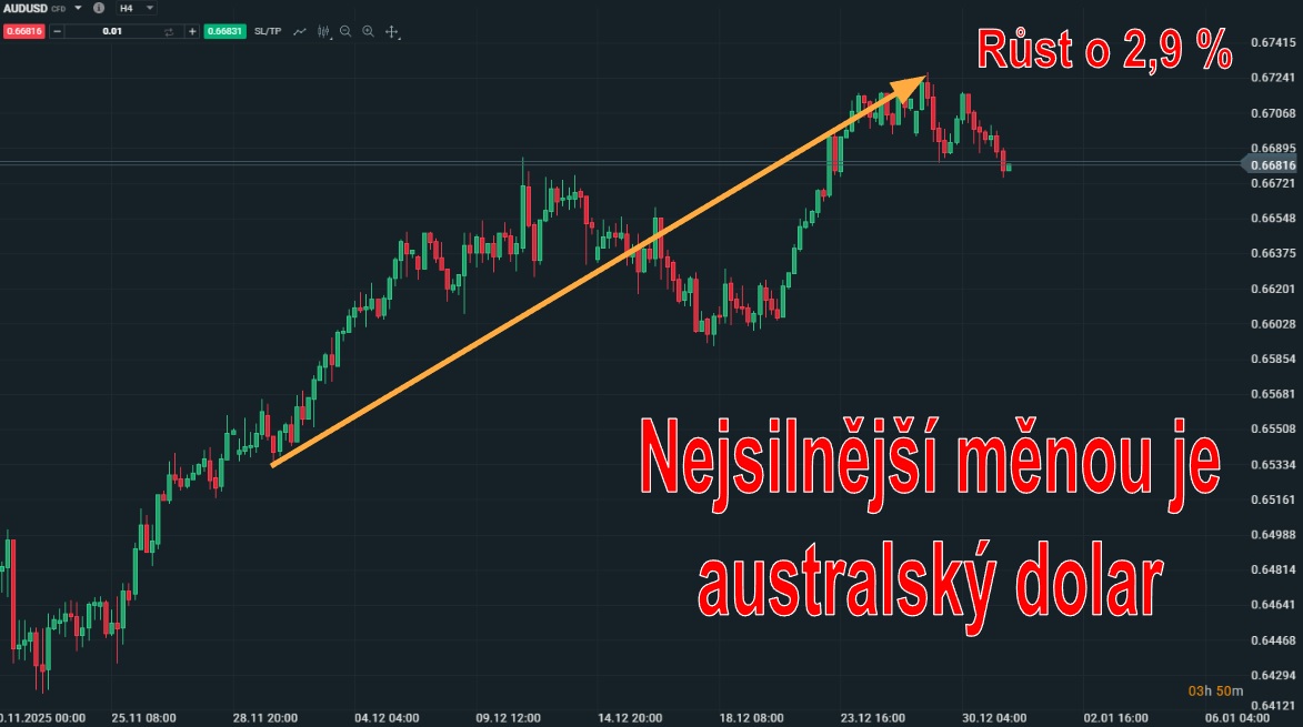 Trochu překvapivě se v prosinci stal nejsilnější měnou australský dolar, který vůči americkému dolaru posílil o 2,9 %. Závěr měsíce sice přinesl menší prodejní korekci, ta však nic nemění na skutečnosti, že americký dolar zůstává dlouhodobě pod tlakem. Právě tento vývoj ponechává prostor pro pokračující posilování australského dolaru a vytváří zajímavé příležitosti pro obchodníky i v průběhu roku 2026.