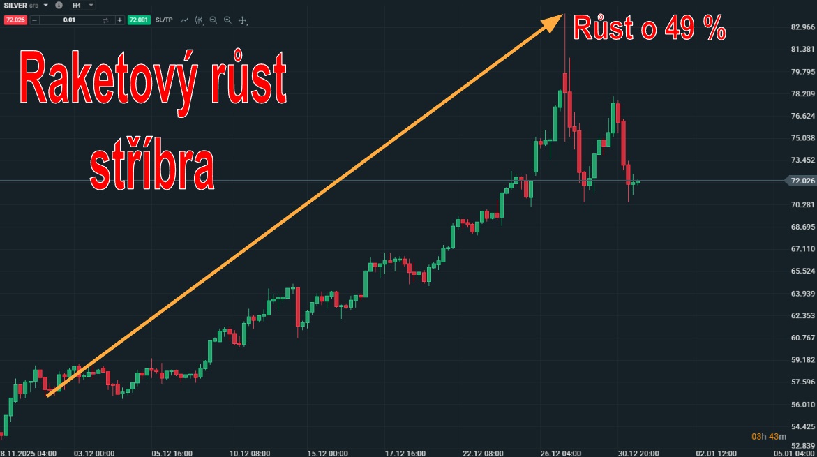 Stříbro zůstává nepřehlédnutelným lídrem komoditních trhů a svou výjimečnou výkonnost potvrdilo i v prosinci, kdy jeho cena vzrostla o dalších 49 %. Závěr roku tak obchodníkům nabídl prostor pro velmi zajímavé zisky a potvrdil sílu probíhajícího trendu. Současně se však začínají objevovat pochybnosti o férovém ocenění, což zvyšuje nejistotu na trhu a otevírá prostor pro prodejní korekci, jejíž náznaky byly patrné již v samotném závěru prosince.