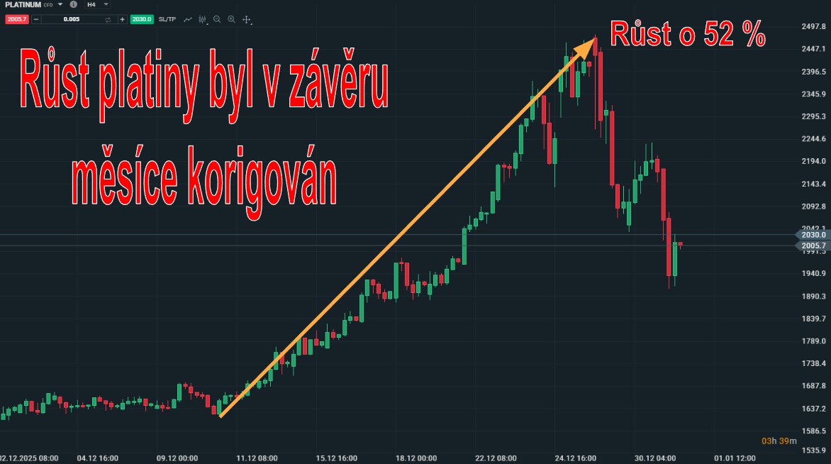 Další komoditou, která v prosinci dokázala obchodníkům výrazně vydělat, byla platina. Právě zde se však ukázalo, jak důležité je umět si zisky vybrat, dokud jsou na stole. Na konci měsíce totiž cena platiny výrazně kolísala a část předchozího růstu rychle smazala, přesto však šlo o mimořádně dynamickou jízdu, na níž bylo možné vydělat velmi slušné peníze.