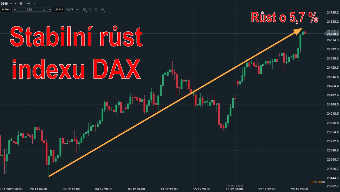Nejvýkonnějším akciovým indexem v prosinci byl německý DAX, který si v rámci stabilního růstového trendu polepšil o 5,7 %. Během měsíce došlo pouze k jedné prodejní korekci, jež byla rychle negována, a právě tento vývoj umožnil obchodníkům využít příležitosti k dosažení velmi pěkných zisků.