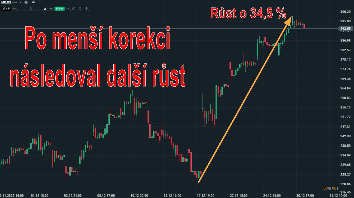 Akcie Micron v prosinci navázaly na svou spanilou jízdu a ve druhém pololetí roku 2025 patřily k nejvýkonnějším titulům na trhu. Jen v druhé polovině měsíce si připsaly dalších 34,5 %, přičemž tomuto růstu předcházela prodejní korekce, která mohla souviset s výběrem zisků po předchozím mimořádně silném růstu. Právě tato kombinace trendu a volatility způsobila, že se akcie Micron výrazně podílely na přílivu peněz do peněženek obchodníků.