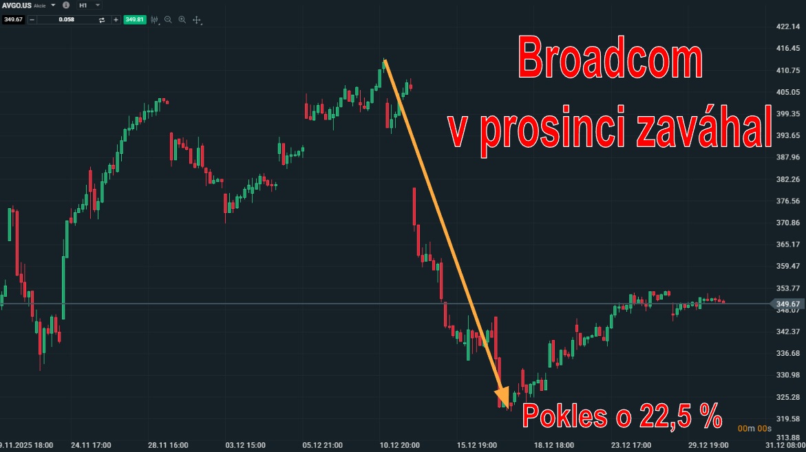 V prosinci ovšem zaváhaly akcie Broadcom, které po vytvoření dvojitého vrcholu, tedy reverzní formace podle technické analýzy, výrazně oslabily. Spekulace na pokles ceny těchto akcií tak obchodníkům nabídly zajímavé příležitosti, jelikož cena akcií během několika prosincových dní klesla o 22,5 %.