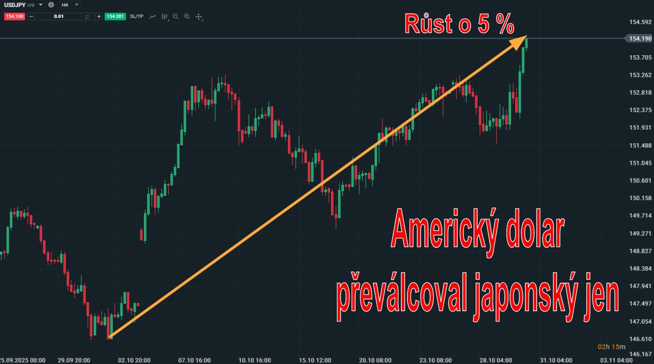 Americký dolar se v říjnu po delší době opět dostal ke slovu a stal se nejsilnější měnou měsíce. Na opačném konci žebříčku skončil japonský jen, který vůči dolaru ztratil přibližně 5 %. Obchodníci, kteří vsadili na návrat síly americké měny, tak mohli sklízet zisky napříč trhem, přičemž největší pohyby zaznamenal právě pár USD/JPY.