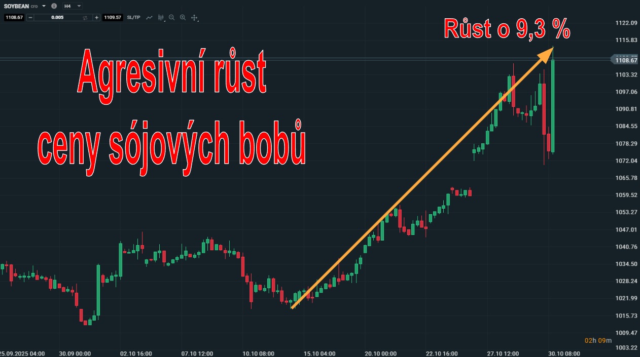 Sójové boby obvykle nepatří mezi nejoblíbenější komodity obchodníků, ale tentokrát je rozhodně bylo proč sledovat. V říjnu totiž jejich cena prudce vzrostla o 9,3 %, a to poté, co Spojené státy oznámily uzavření nové obchodní dohody. Kdo měl odvahu sáhnout po méně populárních trzích, mohl si tak přijít na velmi zajímavé zisky.