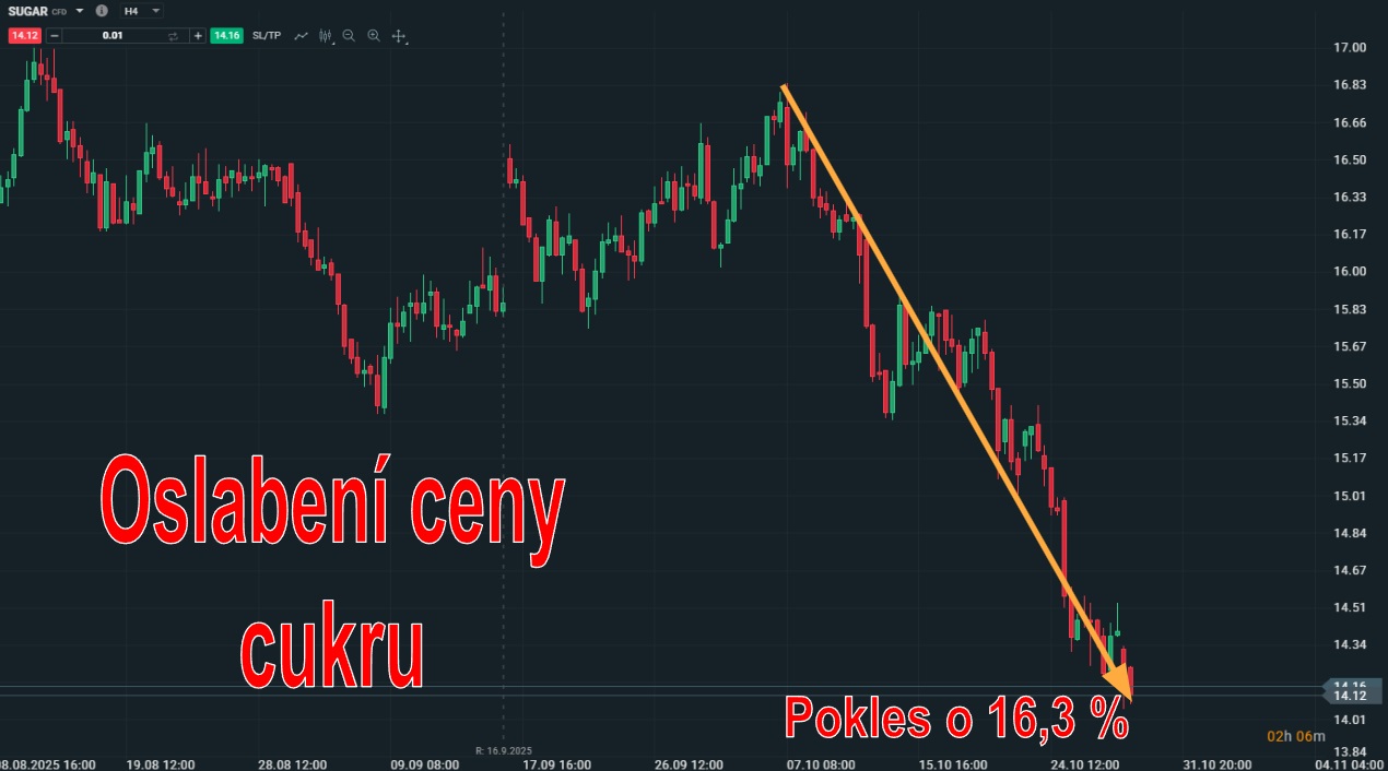 Naopak cena cukru se v říjnu na světových trzích výrazně propadla a pokračovala tak v dlouhodobém sestupu, který zatím nenašel své dno. Spekulanti sázející na pokles sice museli počítat s náklady na swap, přesto si na této komoditě mohli přijít na víc než jen solidní zisky.