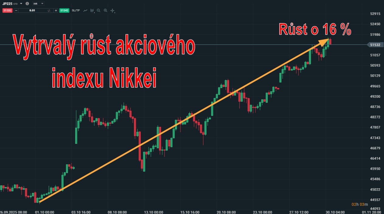 Akciové indexy po celém světě pokračovaly v růstu, avšak titul nejvýkonnějšího si znovu udržel japonský Nikkei. Tento index si v říjnu připsal dalších 16 % a až na jednu výraznější korekci nabídl obchodníkům velmi příjemné zisky. Zbývá jen otázka, zda svou dominanci dokáže obhájit i v listopadu.