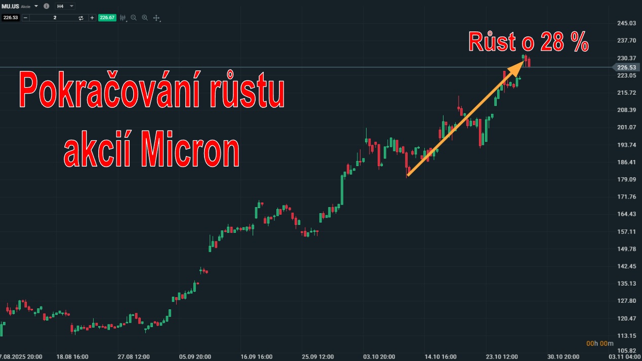 Dalším titulem, který dlouhodobě posiluje, je Micron. Akcie této společnosti v říjnu navázaly na silný zářijový růst a přidaly dalších 28 %. Micron se stal miláčkem obchodníků, kteří na něm pravidelně inkasují výrazné zisky. Akcie se navíc i na konci měsíce drží poblíž svých cenových maxim, což může naznačovat pokračování růstového trendu i na začátku listopadu.