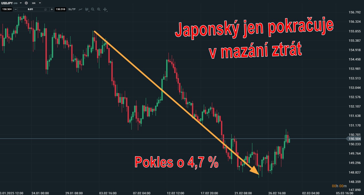 Japonský jen byl v únoru dominantní měnou a dokázal silně posílit vůči americkému dolaru. Nejistota na finančních trzích, kterou vyvolává politika amerického prezidenta Donalda Trumpa, nutí investory hledat „bezpečné přístavy“ pro svůj kapitál. Z této situace v únoru těžil právě japonský jen, který si vůči dolaru připsal zisk +4,7 % (měnový pár USD/JPY tím pádem prudce oslabil).