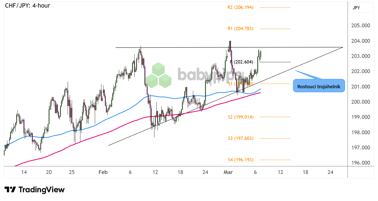 Měnový pár CHF/JPY se na 4hodinovém grafu aktuálně přiblížil k rezistenci rostoucího trojúhelníku kolem psychologické hladiny 203,50. Nyní bude důležité, jakým směrem cena tuto formaci prorazí a tím dojde k zahájení nového krátkodobého trendu. Tradeři tak nyní mohou vyčkávat na jasný průraz jedním směrem.