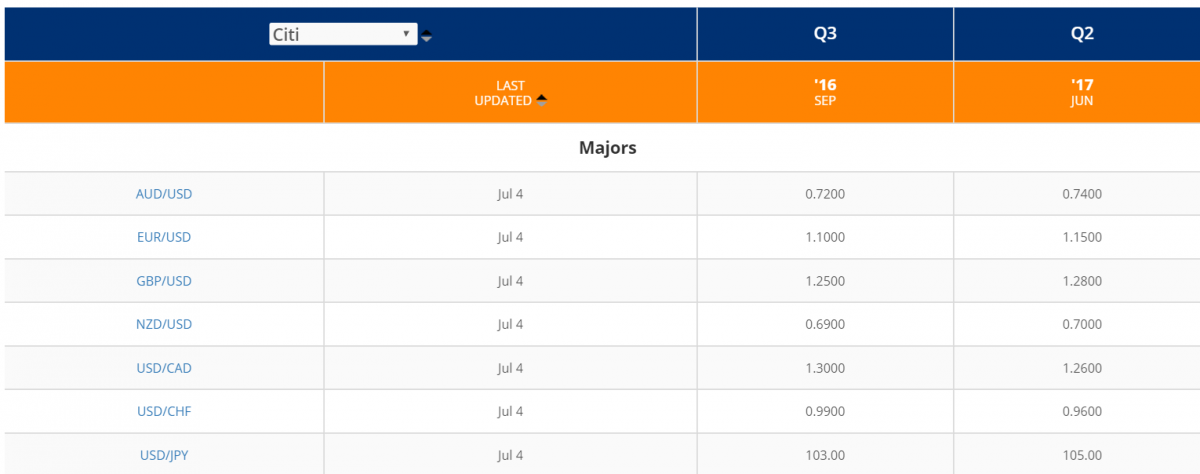 Investiční banka Citi (oddělení CitiFX) vytvořila předpověď pro vybrané měnové páry. Ve sloupci Q3 můžeme vidět cílové kurzy měnových párů pro třetí čtvrtletí letošního roku. Sloupec Q2 pak představuje cílové kurzy měnových párů pro druhé čtvrtletí roku 2017.