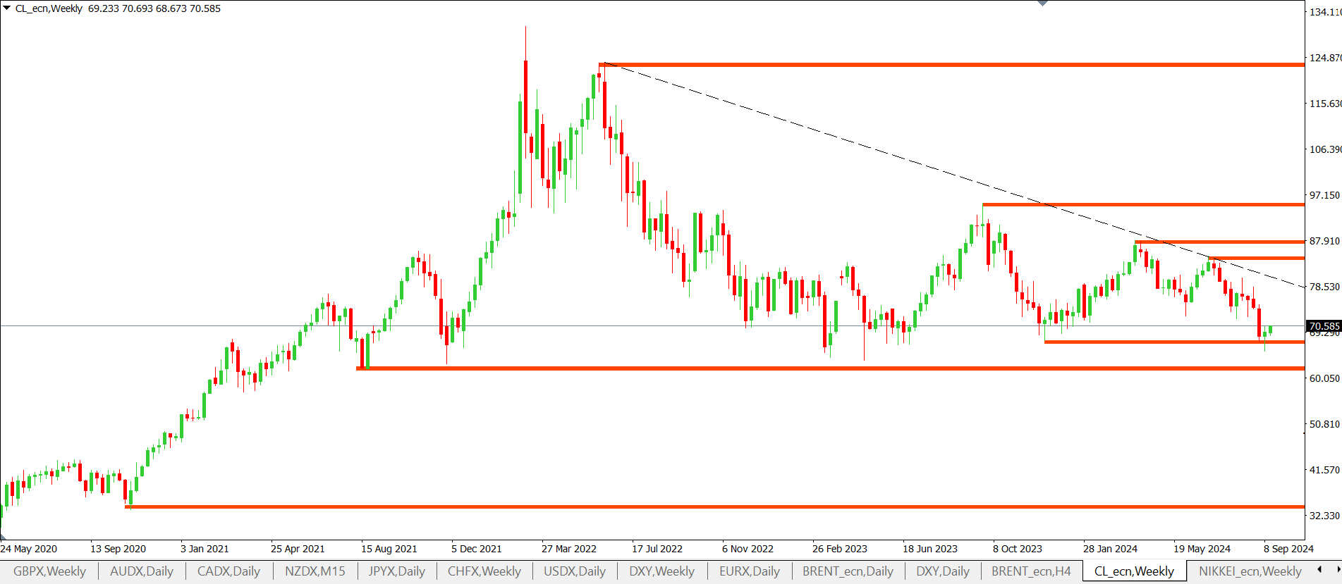 Na ropě WTI je cenový vývoj podobný. Avšak zatímco ropa Brent dosáhla nedávno na ceny z roku 2021, tak WTI otestovala ve stejné době hodnoty z dubna roku 2023. Pokles je na WTI tedy o něco mírnější.