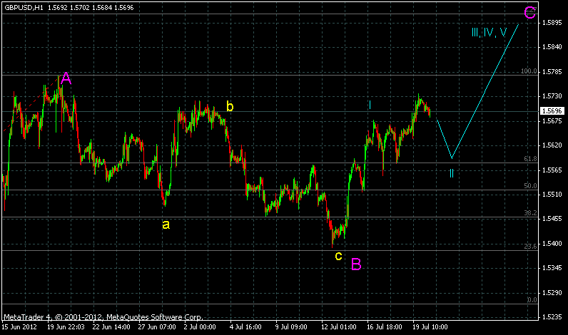 Na tomto páru mi předpoklad příliš nevyšel , před tímto longem jsem očekával ještě short pohyb v další formaci, no vypadá to že jsem špatně spočítal předchozí short impuls který stejně jako na EUR/USD dodělával B vlnu větší roviny. Nyní se Libra nachází v C vlně této roviny ( fialová) , vypadá to , že je v korekci II tohoto impulsu a tato korekce asi bude běžící kombinace, nebo rovina. Pokud je to tak dobře, pak by nás měly čekat ještě vlny II, IV, V k hladině minimálně 1.5900.