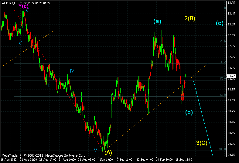 Pokud je tato analýza správná a vlna 2(B) splní požadavky pro vlnu 2 impulsu, pak lze očekávat sestup v 3(C) vlně do oblasti 74-75 . V případě long nad 83.55 tato analýza selhává .