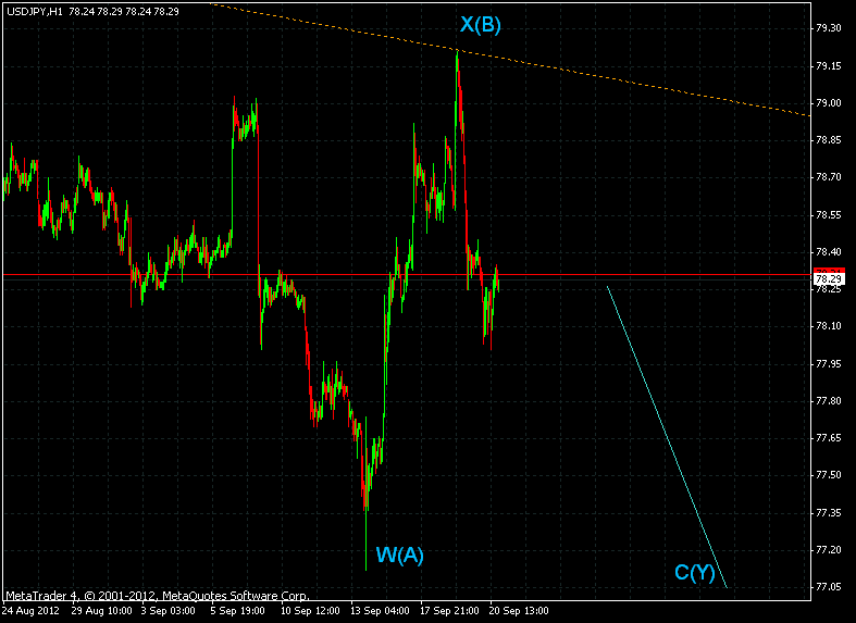 DolarYen překvapil tento týden prudkým long pohybem , který bohužel způsobil NEpotvrzení předchozí varianty s horizontálním trojúhelníkem a musel jsem analýzu předělat. Stále platí short varianta ( long nebyl zatím potvrzen) , na 4h a denním grafu je vidět jak short zpomaluje, takže se dost možná dostává do popředí možnost o které jsem se zmínil již dříve a to jest velká long rovina , jejíž B vlna by se v současné době dodělávala. Očekávám, že by ještě mohlo dojít k dodělání kombinované korekce modré Y a současně i Y vyššího řádu někde okolo 76-75 a potom nástup do long C vlny s cílem okolo 84-85. Pokud by již k poklesu nedošlo a nadále jsme longovali, pak by to znamenalo, že již ve vlně C jsme , ale toto by se potvrdilo až dosažením nad hladinu 80.