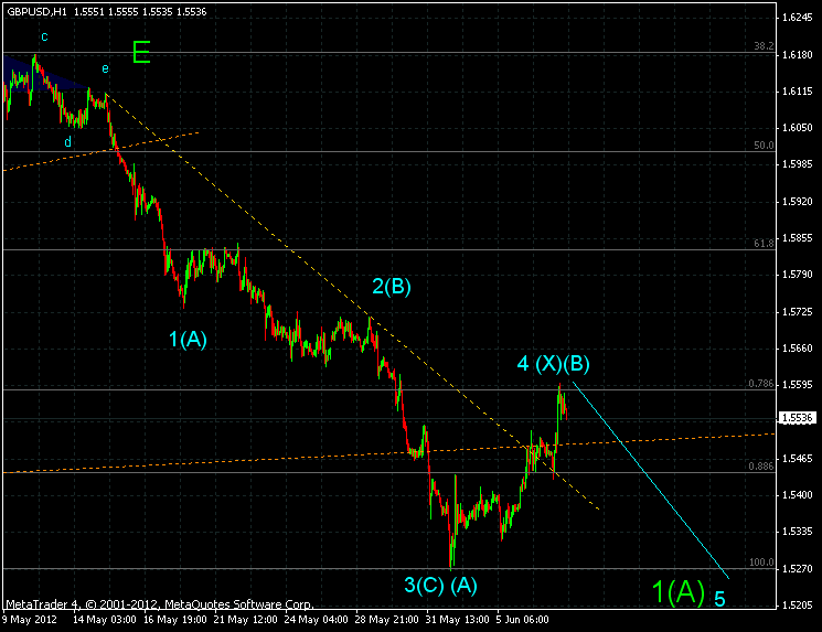 Libra se chová zatím podle předpokladu a ukončila 3(C) vlnu, nyní dokončuje long vlnu 4(X) , nebo započala B vlnu v případě že short byl jen CikCak ABC. V případě že jde o impuls, přijde ještě short vlna 5 , v případě že šlo o CikCak a nyní jsme v X vlně, potom přijde short další korekční formace. V případě že šlo o CikCak a nyní jsme v B vlně, pak by se tvořila velká rovina nebo trojúhelník a cíl B vlny by byl minimálně okolo hladiny 1.5800. V případě impulsu nesmí vlna 4 zasáhnout do oblasti vlny 2 , to jest hladina 1.5630.