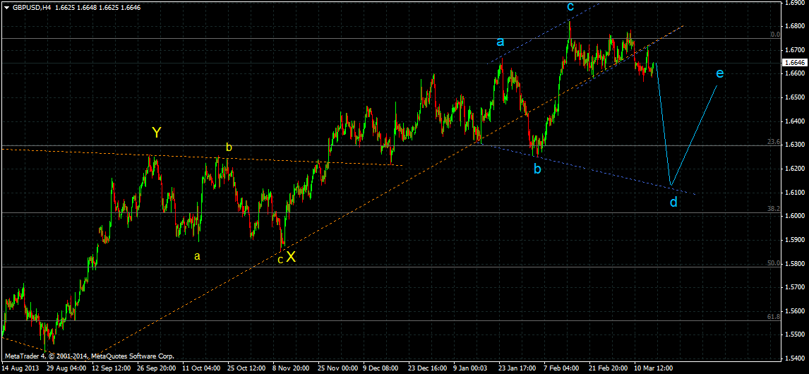 Měnový pár EUR/USD pokračoval ještě dalším swingem v long pohybu, takže riskantní short proti trendový obchod popisovaný v minulé analýze by tentokrát skončil na SL. Zatím tedy nedošlo k porušení TLX-X, takže pro konzervativce je zatím na short čas. Pokud jsme v B vlně velké X vlny v podobě roviny (modré značení), potom platí v podstatě stále předchozí analýza. Pokud bychom byli stále ještě v long Z formaci, potom bychom mohli být v C vlně roviny (žluté značení), ve které se při troše trpělivosti dá nalézt impulsní tvar (start diagonál). V obou případech bychom se ale měli již brzy dočkat většího short pohybu.