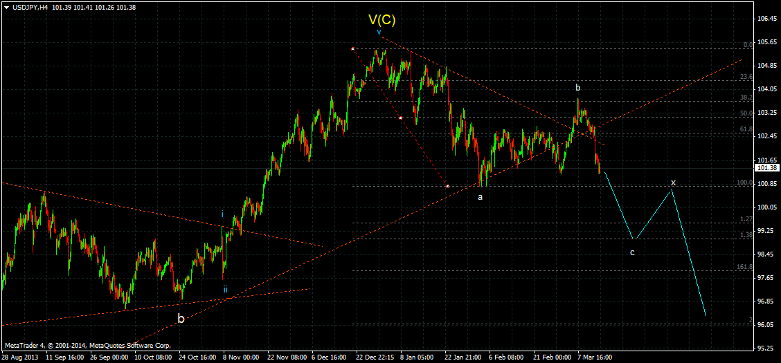 Měnový pár USD/JPY zatím potvrzuje myšlenku, kterou jsem uvedl v minulé analýze. Poupravil a přečísloval jsem dlouhodobou i krátkodobou analýzu a předpokládám, že jsme nyní v korekci k hladině 96-97, nebo v dlouhodobějším short pohybu. Zatím to vypadá, že se naplnil předpoklad short roviny, i když jsem čekal ještě kousek long v B vlně, ale jak jsem uvedl minule, podmínky B vlny roviny byly již před týdnem splněny, takže short C impulsní vlna byla na řadě. Myslím, že by mohla dosáhnout až k hladině okolo 99 a potom by přišla menší X vlna před dalším korekčním poklesem. Samozřejmě dopředu odhadnout přesný tvar je téměř nemožné, pomoci nám mohou hlavně SL, TL, kanály apod. Důležité je, že známe primární směr a můžeme tak nastupovat v potenciálních obratových bodech do tohoto směru.
