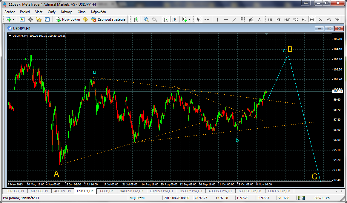 Tento měnový pár nám konečně po dlouhé době prorazil trendline vymezující hranice horizontálního trojúhelníku. Pohyboval se v něm tak dlouho, že zde máme několik variant kde je trojúhelník po zkrácení jako jedna vlna. Nakonec si myslím, že jak jsem namaloval do obrázku, byl trojúhelník až jako short B (modrá) podvlna B (žlutá) vlny korekce. Nyní bychom tedy měli být v modré C vlně long s těžko definovatelným cílem mezi 101-103.