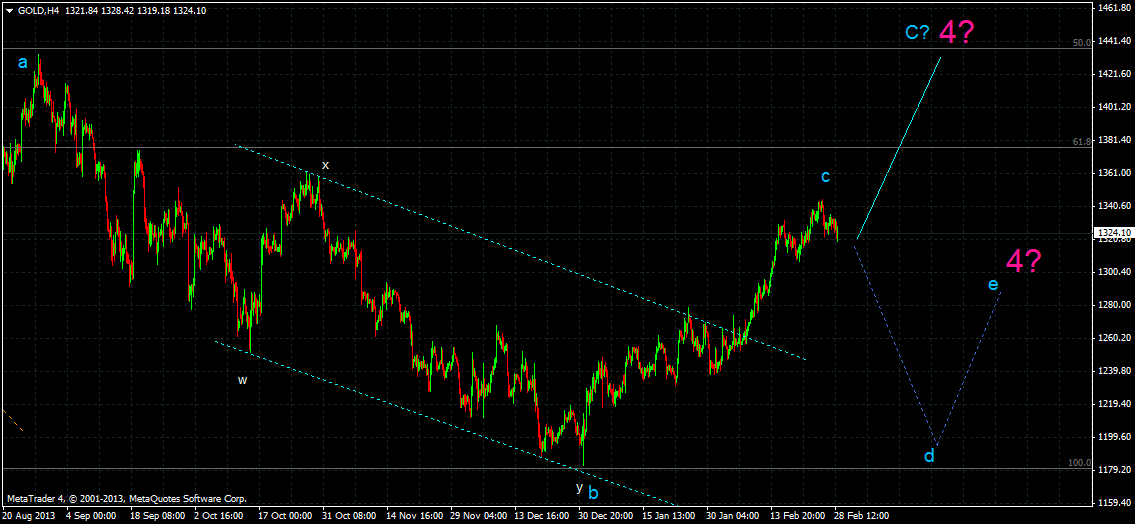 Zlato stále pokračuje v long pohybu, nyní jsme tedy zřejmě v C vlně korekce. Jelikož zatím tato long vlna nesplňuje příliš pravidla pro impuls, nemusela by tato korekce být rovina, ale horizontální trojúhelník, jak jsem vyznačil v obrázku. Jelikož jde o vlnu 4 (růžová), není ani jedna z variant vyloučena.