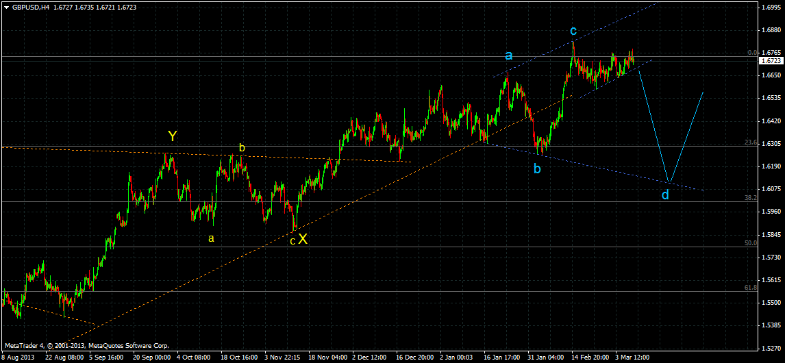 Měnovému páru EUR/USD se podařilo prorazit na nové High, byl to však prozatím jen spíše pokus o průraz a následně se cena vrátila o kus zpět. Naskytla se zajímavá situace – celý long pohyb X(B) modrý je korekčního charakteru, podle všeho máme hotovou trojitou kombinaci a vyznačenu TL X-X. Došlo k pokusu o průraz High a pak k poklesu ceny zpět. To vše dohromady naznačuje, že bychom stále mohli být v B vlně roviny (nepravidelné roviny), a tudíž by mohla následovat short C vlna impulsního charakteru. Staví nás to do situace, kdy bychom mohli uvažovat o vstupu do protitrendového obchodu, ikdyž je tu jisté riziko, že bychom mohli být stále ještě v long formaci Z, jak jsem popisoval minule. Proti této variantě však stojí fakt, že nyní nejsme v impulsu, abychom mohli říct, že jsme v C vlně formace Z. Takže proto já osobně se kloním k variantě, kterou jsem popsal hned zpočátku.