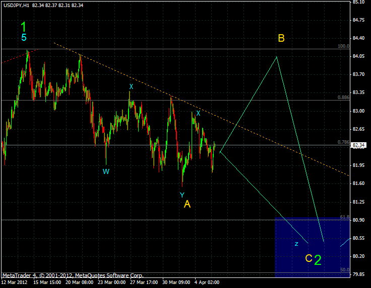EU se začátkem týdne vydal short směrem když opustil trojúhelníkovou formaci, která ukončovala B vlnu roviny, která se formuje na 4h TF. Tato rovina může být buďto korekcí předchozí korekční kombinace a po dokončení impulsu C bude pokračovat long do oblasti 1.3700 , nebo může tato rovina být první short figurou z B vlny ještě větší roviny , potom by cíl této B vlny byl v oblasti okolo 1.2600-1.2800. Podobný průběh by byl i pro verzi , že by se formoval horizontální trojúhelník před budoucím velkým long pohybem ( denní graf).