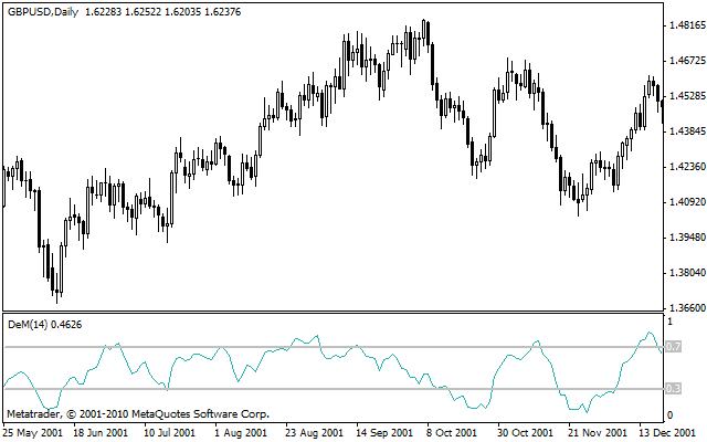 Hodnota indikátoru DeMarker se vypočítá takto: DeMark(i) = SMA(DeMax, N)/(SMA(DeMax, N)+SMA(DeMin, N))