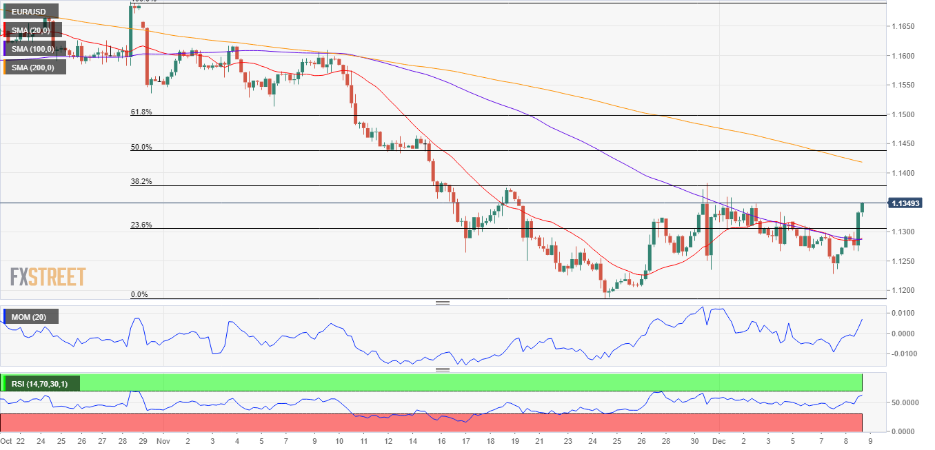 EUR/USD: Tento měnový pár na denním grafu vzrostl a prorazil nad klouzavý průměr SMA 20, ale další růst není jistý. Technické indikátory jsou stále v negativní zóně a rostou. Jsme pod hladinou 38,2 % Fibonacciho retracementu (1,1380), což je také nejbližší rezistence. Na 4hodinovém grafu má cena mírný býčí potenciál. Cena překonala SMA 20 a SMA 100, které konvergují blízko sebe. Technické indikátory jsou v pozitivní zóně a míří do strany.