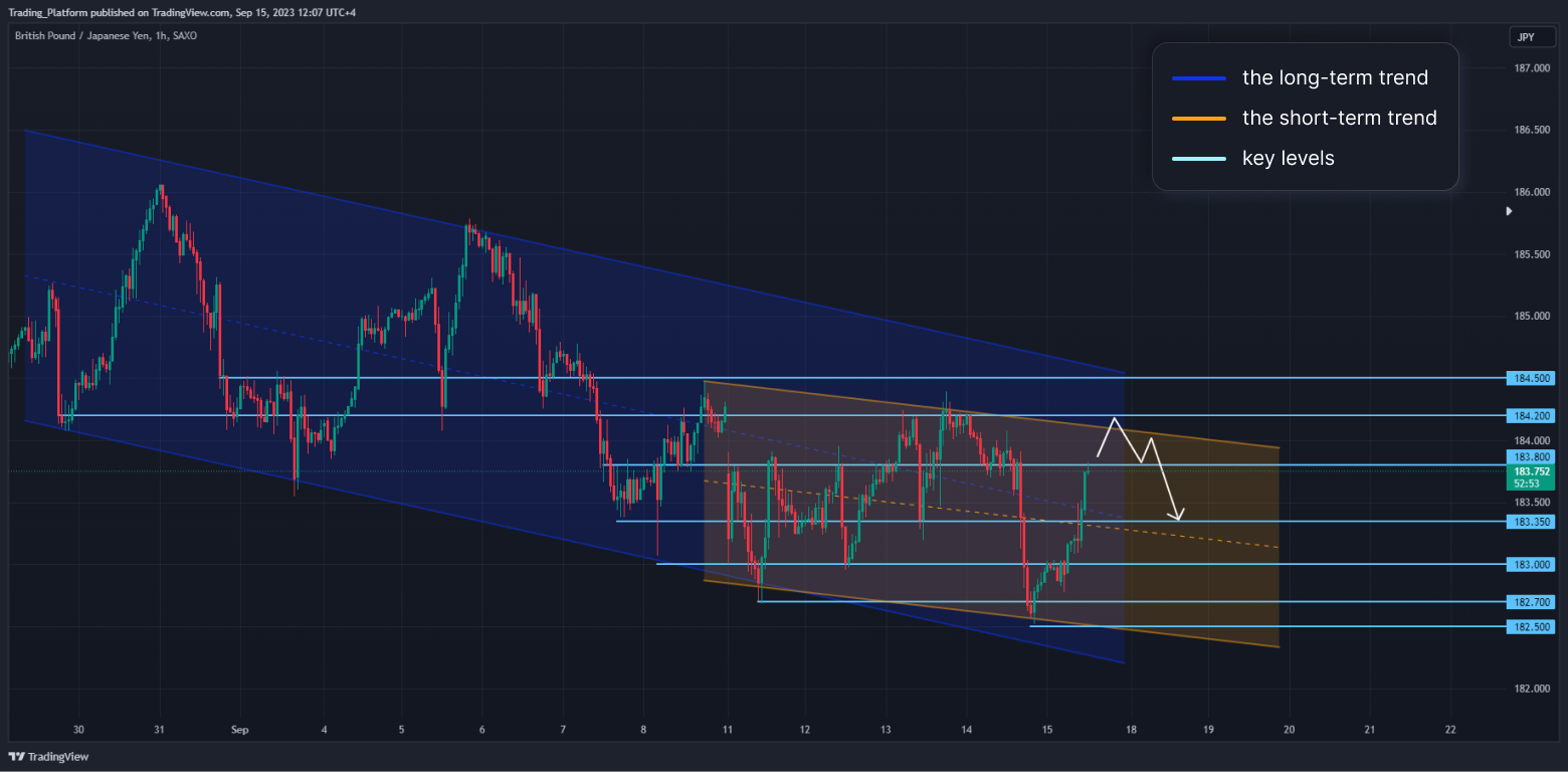 GBP/JPY: Tento měnový pár je na 1hodinovém grafu v dlouhodobém klesajícím trendovém kanálu, krátkodobě jsme v klesajícím trendovém kanálu. Cena je neutrální v pásmu 183,35 – 184,20 a jeho proražení naznačí další směr. Když cena překoná důležitou hladinu 183,80, můžeme otestovat hladinu 184,50, kde by mohl stoupnout prodejní tlak. Dokud jsme pod hladinou 184,50, mohli bychom hledat short příležitosti.