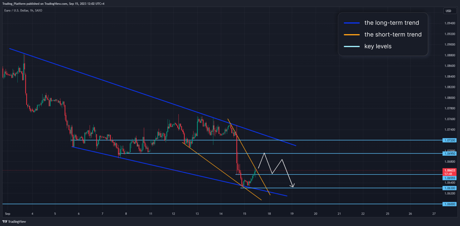 EUR/USD: Tento měnový pár je na 1hodinovém grafu v dlouhodobém klesajícím trendovém kanálu, krátkodobě jsme v klesajícím klínu. Cena koriguje z hladiny 1,0630, ale býčí impulz je slabý. Nyní bychom mohli otestovat hladinu 1,0695 a pak opět klesat. Dokud jsme pod hladinou 1,0700, mohli bychom hledat short příležitosti.