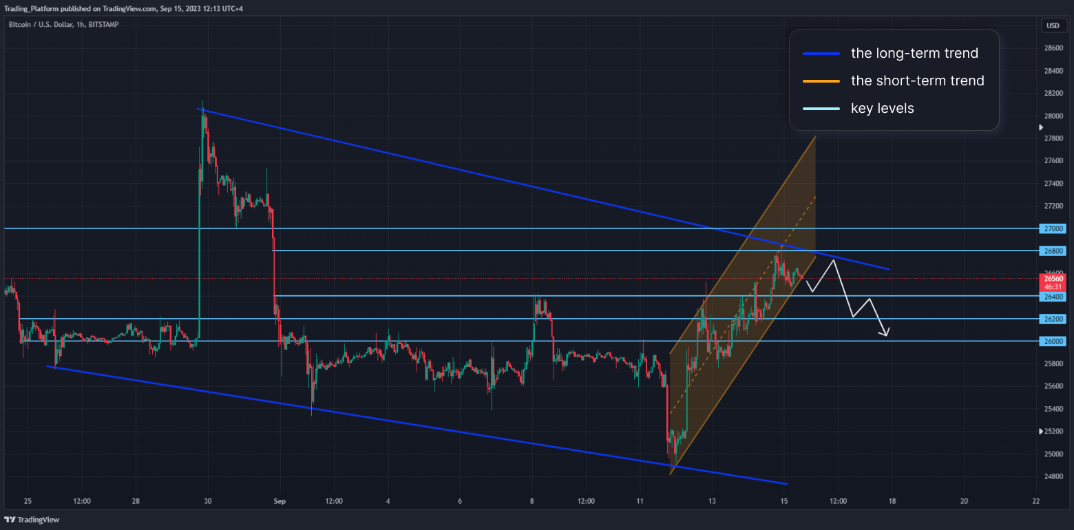 Bitcoin (BTC/USD): Tato kryptoměna je na 1hodinovém grafu v dlouhodobém klesajícím trendovém kanálu, krátkodobě jsme v rostoucím trendovém kanálu. Cena zřejmě proráží rostoucí kanál a mohli bychom otestovat hladinu 26400. Její prolomení by otevřelo cestu k hladině 26000. Dokud jsme pod hladinou 27000, mohli bychom hledat short příležitosti.