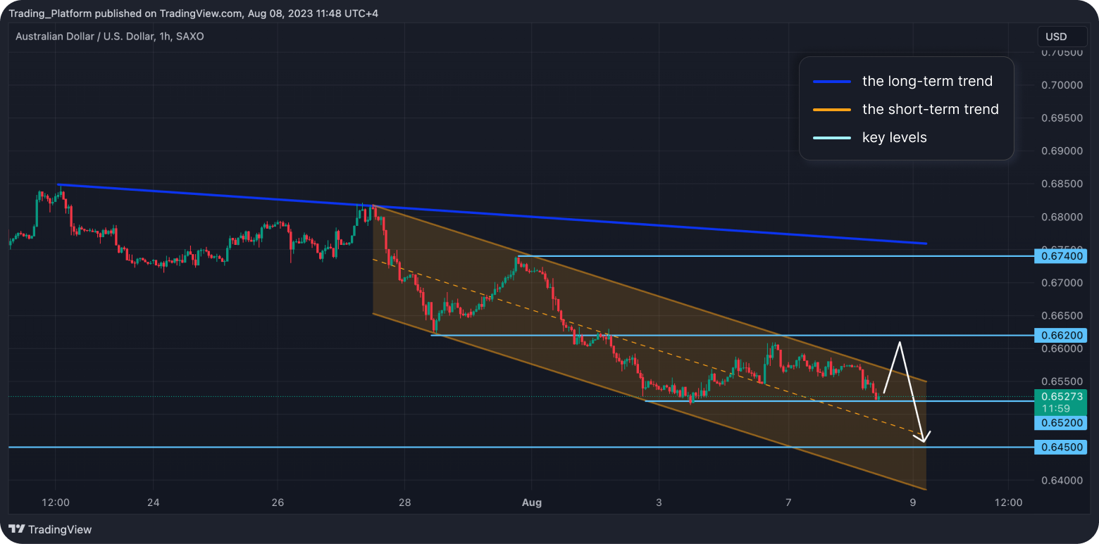 AUD/USD: Tento měnový pár je na 1hodinovém grafu v dlouhodobém klesajícím trendu a krátkodobě jsme v klesajícím trendovém kanálu. Cena konsoliduje u klíčové hladiny 0,6520. Nyní bychom mohli korigovat k rezistenci 0,6620 a opět oslabovat k 10měsíčním minimům na 0,6540. Dokud jsme pod hladinou 0,6740, mohli bychom hledat short příležitosti.