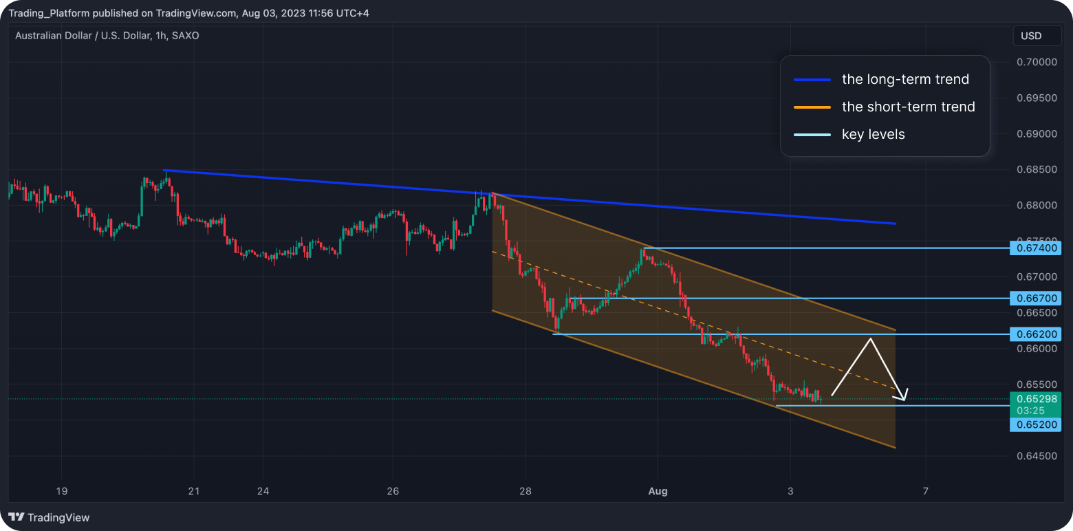 AUD/USD: Tento měnový pár je na 1hodinovém grafu v dlouhodobém klesajícím trendu a krátkodobě jsme v klesajícím trendovém kanálu. Cena konsoliduje u spodní linie kanálu u 0,6520. Nyní bychom mohli korigovat k hladině 0,6620 a opět oslabovat. Dokud jsme pod hladinou 0,6740, mohli bychom hledat short příležitosti.