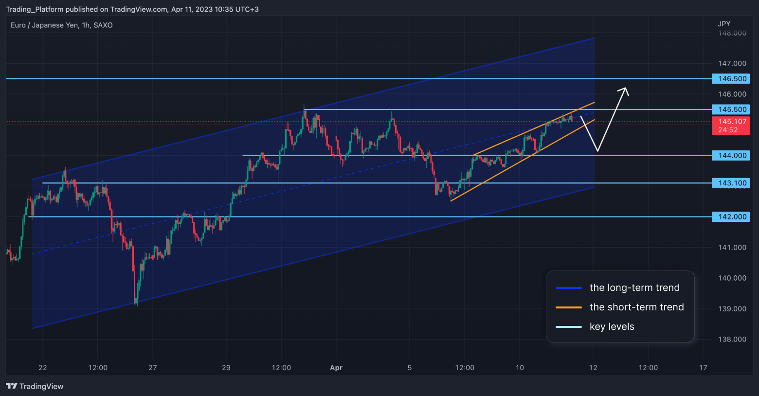 EUR/JPY: Tento měnový pár je na 1hodinovém grafu v dlouhodobém rostoucím trendovém kanálu a krátkodobě jsme v rostoucím klínu. Cena narazila na silnou rezistenci 145,50 a mohla by korigovat k hladině 144,00. Nyní bychom mohli obchodovat do strany, ale mohli bychom se pokusit prorazit vzhůru nad rezistenci a otestovat hladinu 146,50. Dokud jsme nad hladinou 143,10, mohli bychom hledat long příležitosti.