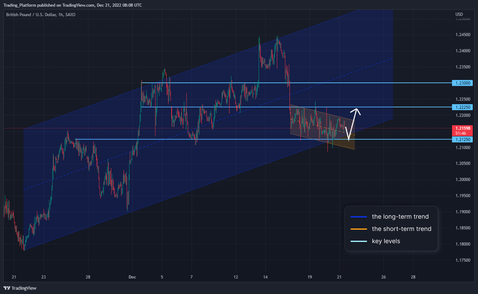 GBP/USD: Tento měnový pár je na 1hodinovém grafu v dlouhodobém rostoucím trendovém kanálu a krátkodobě jsme v klesajícím trendu. Obchodujeme v pásmu 1,2200 – 1,2125 a jeho proražení naznačí další směr. Pouze prolomení pod 1,2100 by přerušilo býčí trend. Dokud jsme nad hladinou 1,2100, mohli bychom hledat long příležitosti.