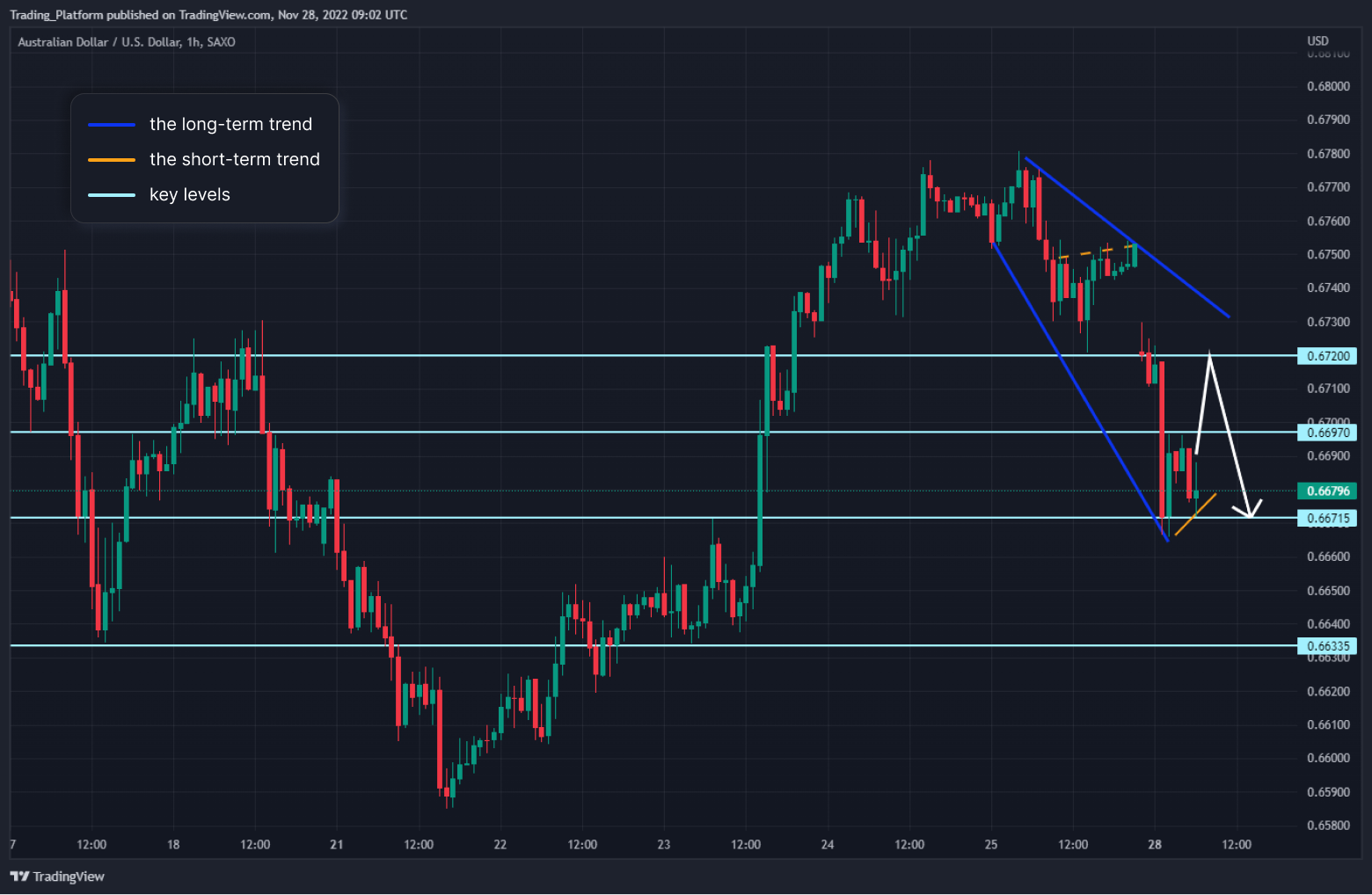 AUD/USD: Tento měnový pár je na 1hodinovém grafu v dlouhodobém klesajícím klínu a krátkodobě jsme u silné rezistence. Cena je poblíž rezistence na 0,6697. Po jejím proražení bychom mohli zamířit k hladině 0,6720. Hlavní trend je ale medvědí a tak je pravděpodobný pokles k hladině 0,6671. Dokud jsme pod hladinou 0,6720, mohli bychom hledat short příležitosti.